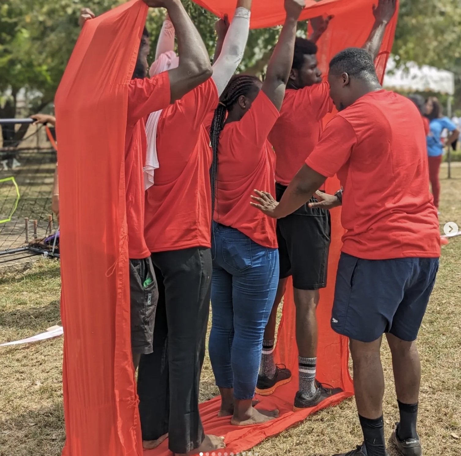 Cloth race Move as one. In Cloth Race, your team shares a single cloth and has to coordinate every step to cross the line. It’s quick, silly, and ridiculously effective for trust and communication. Cloth race in action