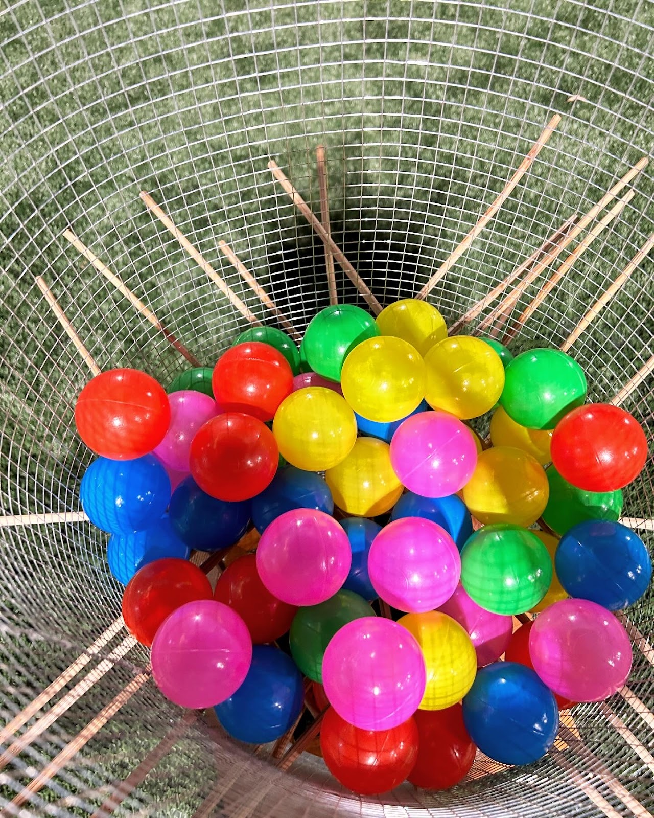 Pass the sticks through the tube to form your Kerplunk web, and place the marbles on top. Once the marbles are held in place by the lattice of sticks, the game begins. Choose a stick to draw from the tube – and hope it doesn’t rattle the marbles.