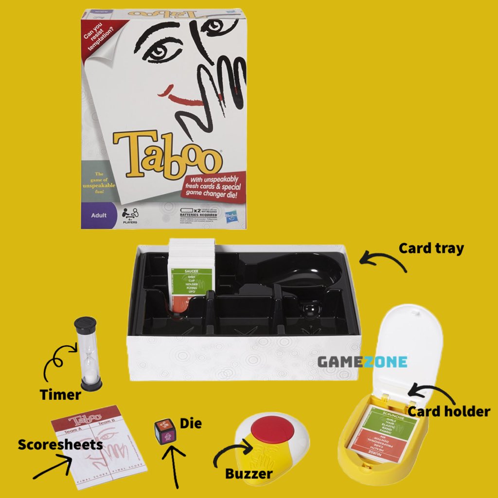 4. Take the top card in the card holder and put it in the easel.The word at the top is the word your teammates will try to guess and the words below are TABOO WORDS. You cannot say them as clues.